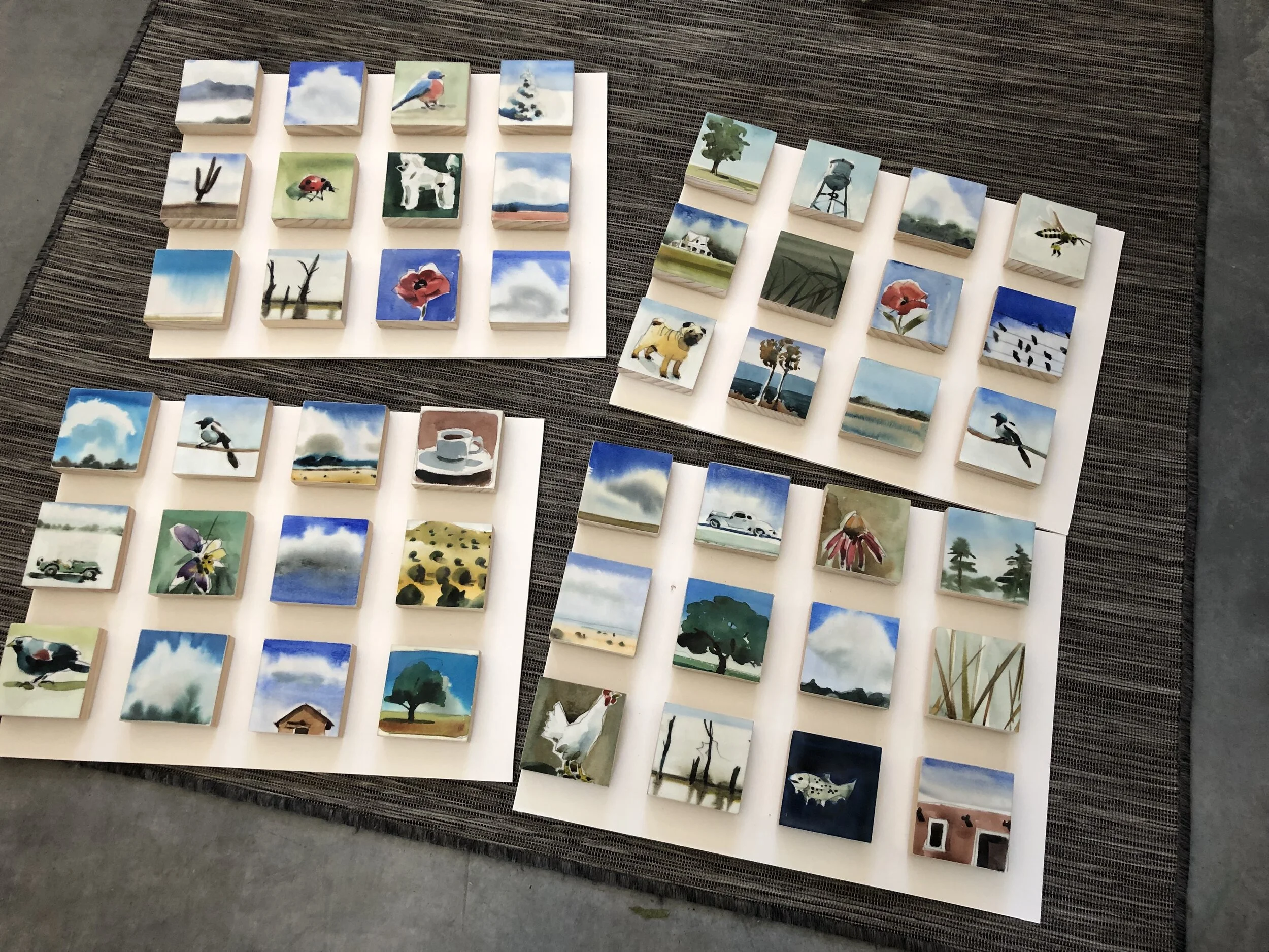 Recently he has returned to its loose simplicity and began experimenting with encaustic which is a heated mixture of beeswax and crystalized tree sap. It was an ancient technique used by Egyptians as far back as the 6th century BC. By adding a layer to the wood mounted watercolor surface, Zimmer creates an object impervious to moisture. The small ‘tiles’ are composed in a grid format, with varied design components, which can be adapted to any space.